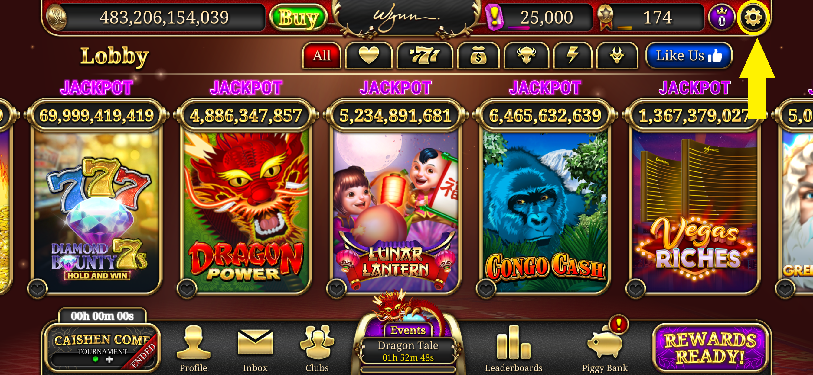 - Go to "Settings" by tapping on the "Gear" icon, located at the top right corner of your lobby screen next to your VIP Level number.