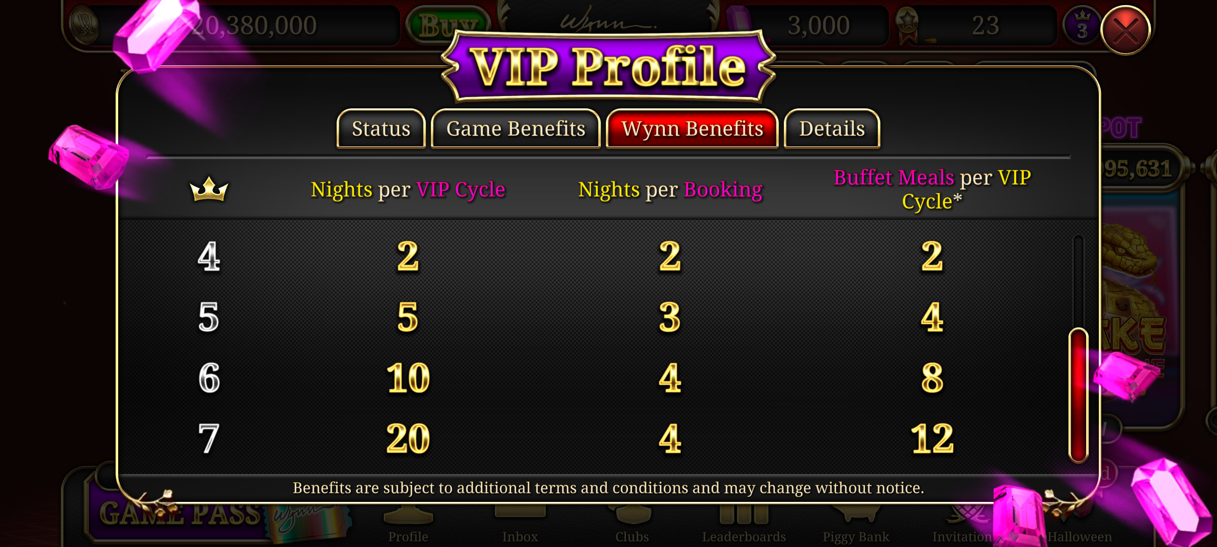 To make a reservation at Wynn Las Vegas or Encore Las Vegas using the Gems, a player needs to reach the required VIP level. To know about your current VIP Level and benefits, please tap on the top right "Crown" icon in the game lobby.