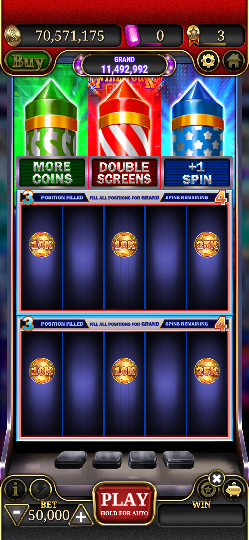 Green, red, and blue coin rockets activate their respective firework bundles. The green firework may upgrade a random orb; the red orb grants two re-spin rounds on the same slot machine, and the blue orb provides four spins in its corresponding re-spin rounds.