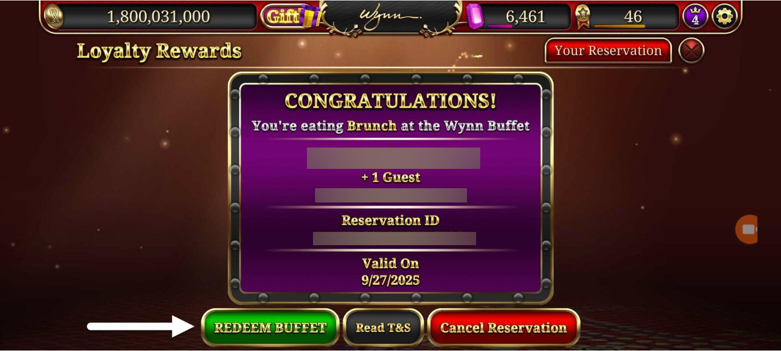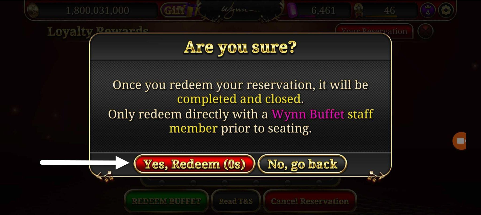 IMPORTANT: Only do this when you are physically present at the buffet and instructed to do so by a Wynn staff member. - Final Confirmation: Tap “Yes, Redeem” to finalize. Once confirmed, the reservation will disappear from the Rewards screen and cannot be used again.