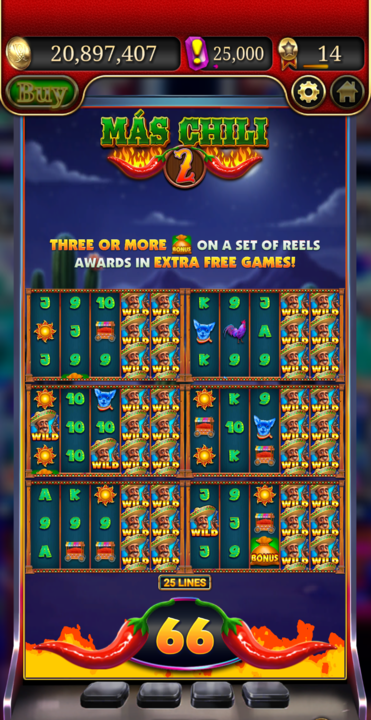 The Feature triggers when 3 or more BONUS symbols appear. Players are awarded 10 Free Games, played across two screens initially. During the Feature, collecting symbols adds extra screens and Wild symbols, enhancing the game experience. Every collected Chili symbol during Free Games is counted toward the Chili Meter: