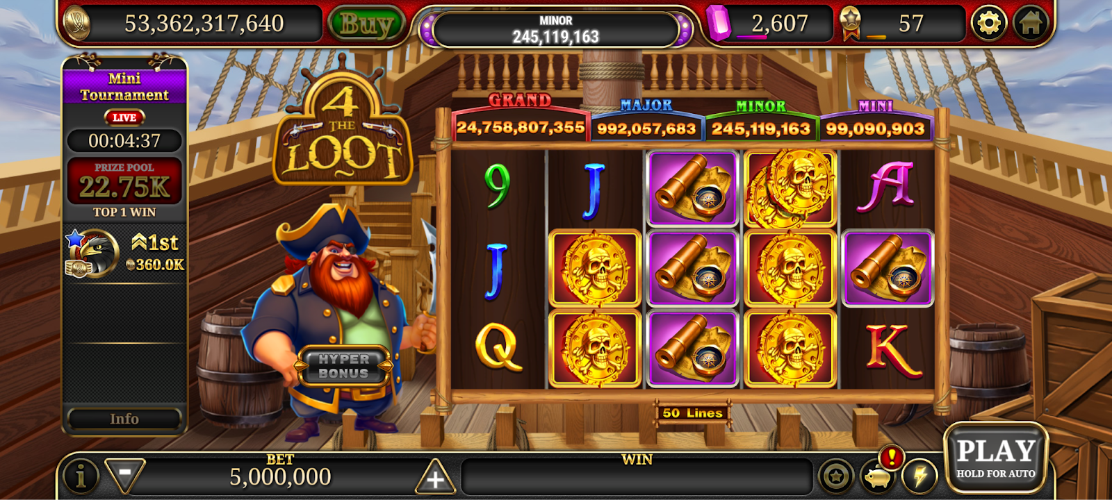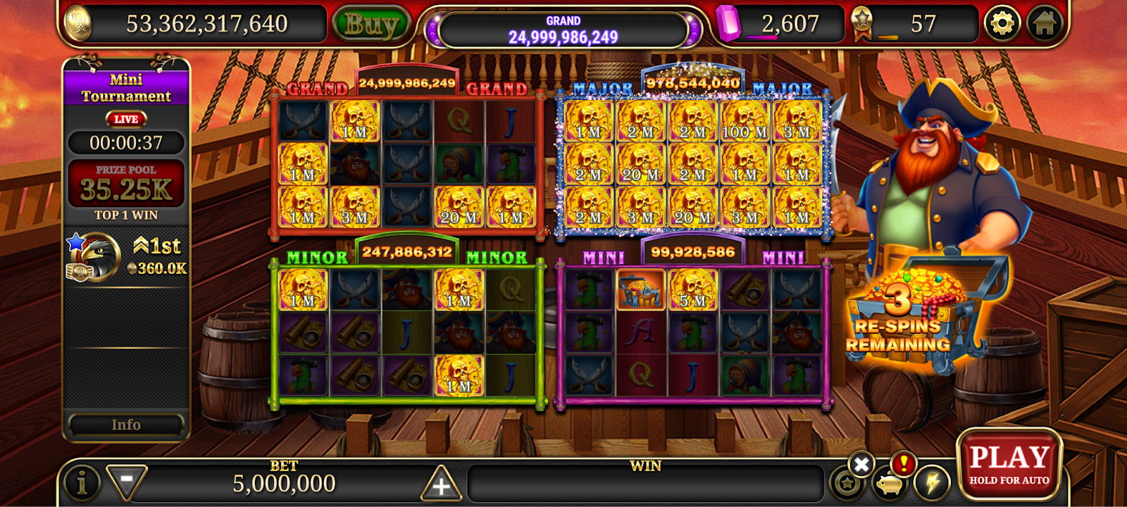 Collect 6 or more Golden Doubloons in a single spin to activate the ReSpin Feature. Once triggered, 8 respins are awarded. The triggering Doubloons are randomly distributed across four separate 5x3 reel grids, each representing the Mini, Minor, Major, or Grand Jackpot, and they remain locked for the duration of the feature.