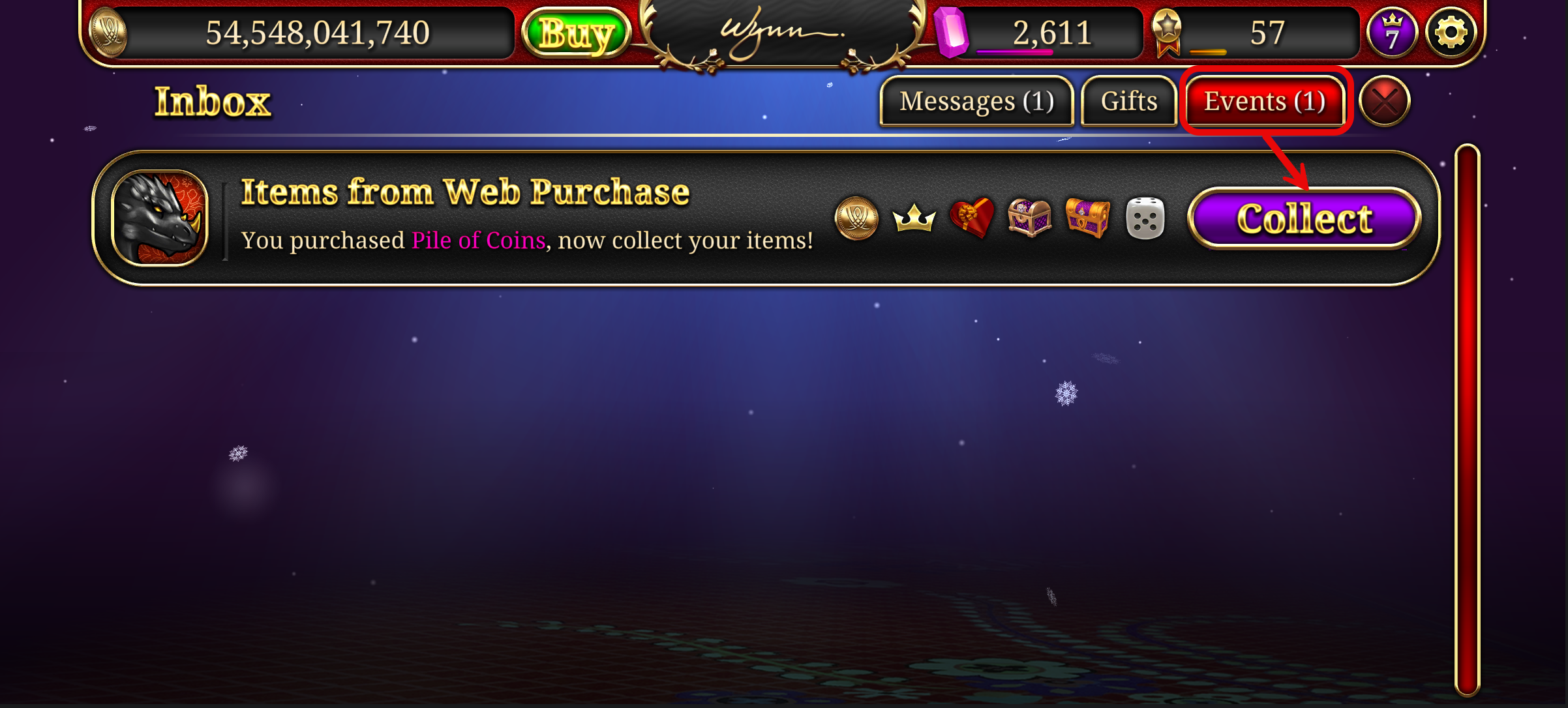 Fig 5: Collect the purchased coins from Events tab of your game's Inbox